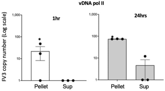 Detection of FV3 binding to Bd using qPCR. FV3 was incubated with Bd at 1 MOI in 1 mL volume for 1 and 24 h. Samples were then centrifuged at 700× g and both pellets and supernatants were subjected to qPCR with FV3 specific primers (vDNA pol). * Statistical differences (p < 0.05).