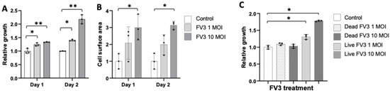 Based on our observation of FV3’s ability to bind Bd and induce aggregation of the fungus, we hypothesized that FV3 should impair Bd growth. We tested this hypothesis first by assessing Bd growth via an ATP assay. Surprisingly, we found that rather than inhibiting, FV3 was stimulating Bd growth (Figure 4). Growth of Bd increased with increasing concentrations of FV3 (Figure 4A). To substantiate these results and rule out possible contribution of FV3 on ATP consumption, zoospores were counted under a microscope and the total cell surface area per field of view was determined. Similar to the ATP growth assay, the cell surface area significantly increased with increasing FV3 concentration (Figure 4B). Furthermore, zoospore production increased from 170–270 per µL in the control wells to 520–540 and 880–1050 zoospores per µL in 1 MOI and 10 MOI FV3 respectively. Importantly, Bd growth stimulation required live virus, since incubation of heat-killed FV3 did not induce any significant effect (Figure 4C).