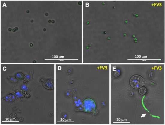 FV3 infection of Bd detected using fluorescence microscopy. FV3 was added to Bd culture at 1 MOI in 1 mL volume and incubated for 24 h. Detection of FV3 was performed by staining with the anti-53R rabbit polyclonal Ab followed by FITC-conjugates goat anti-rabbit Ab (green). Nuclei were stained with Hoechst (blue). (A,C) Negative control, Mock FV3-exposed Bd culture displaying no FITC signal. (B) FV3-exposed Bd zoospores displaying FITC signal indicating active infection. (C,D,E) Higher magnification of mock- (C) and FV3-exposed Bd zoosporangia (D,E) with FITC signal. Arrow: Chytrid rhizoid with strong FITC signal.