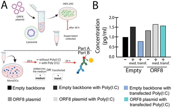 IL-6 levels induced by ORF8 measured with enzyme-linked immunosorbent assay (ELISA) assay. (A) Experimental design used for the experiment. (B) After 24 h post transfection, supernatants from HEK-293 cells transfected with ORF8 and empty vector (PCAGGS), using Lipofectamine™ 3000 (Invitrogen, Waltham, MA, USA), were added onto mono-DCs, either alone (−), in combination with Poly(I:C) (2 μg/mL) in the media (+med.), or transfected (+transf.). After 24 h, the supernatants were collected and subjected to ELISA (R&D Systems) for IL-6. The bars represent the mean value normalized by the control (empty supernatant).