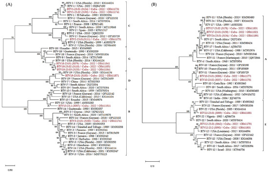 Phylogenetic analysis of S6 sequences of the Cuban BTV strains. Phylogenetic analysis of S6 sequences of BTV-1, 2, 3, 13, 18, 19 (A), 10, 12, 17, 22 and 24 (B) strains using the maximum likelihood method and Tamura–Nei model with 1000 bootstrap replicates in MEGA X. This analysis involved 51 (A) and 37 (B) nucleotide sequences, and there were a total of 1581 (A) and 1645 (B) positions in the final dataset. Bootstrap values appeared at the corresponding nodes. In the phylogenetic tree, accession number, serotype, country and year of sample collection are given. The Cuban sequences are marked in red. Brackets indicate nucleotypes clustering.