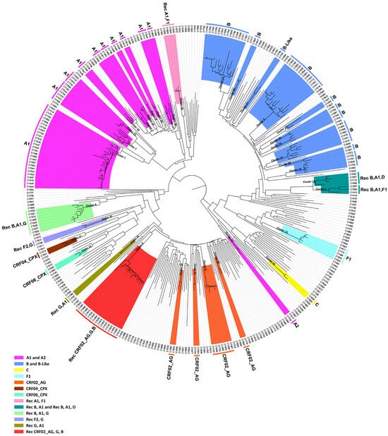 Subsequently, the 16 near-full-length HIV-1 genome nucleotide sequences and 2 partial sequences obtained were utilized to conduct a repetition of the phylogenetic analyses. For each of the four groups of HIV-1 recombinant query sequences, a separate multiple sequence alignment was constructed with a reference dataset of all known HIV-1 group M subtypes (A, B, C, D, F, G, H, J, K, and L) and CRFs. These multiple sequence alignments were created using RIP Alignment 2020, which was accessed from the Los Alamos HIV Sequence Database (http://www.hiv.lanl.gov (accessed on 13 November 2023)). The aforementioned methodology was then reapplied to perform phylogenetic analyses with the aim of demonstrating the distinct and exclusive phylogenetic clustering of these four separate groups of HIV-1 recombinant query sequences, thereby providing evidence of their uniqueness in the context of HIV-1 genetic diversity. Following this, the HIV-1 genotypic subtypes based on the near-full-length HIV-1 genome sequences were determined using the REGA HIV-1 Subtyping Tool Version 3.0 [7].