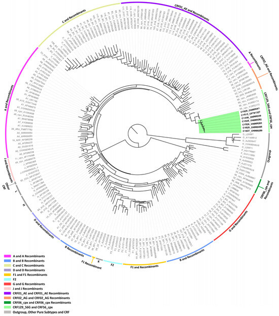 Maximum likelihood phylogenetic tree analyses of the near-full-length HIV-1 genome (790–8795 in the HXB2 genome) nucleotide sequences of the seven HIV-1 recombinants subtyped as “Rec. of B, A1, G” based on the HIV-1 pol region (2253–5250 in the HXB2 genome). The seven HIV-1 recombinant sequences were isolated from whole blood samples of seven respective individuals infected with HIV-1 collected in Cyprus, as part of a prospective molecular epidemiology study (C. Topcu et al., manuscript in preparation for publication) [21] conducted from 9 March 2017 to 14 October 2021. Of the seven individuals infected with HIV-1, six were newly diagnosed and one was chronically infected with HIV-1, while all were antiretroviral-naïve. The phylogenetic analyses were executed against a reference dataset of all known HIV-1 group M subtypes (A, B, C, D, F, G, H, J, K, and L) and circulating recombinant forms (CRFs) (RIP Alignment 2020) downloaded from the Los Alamos HIV Sequence Database (http://www.hiv.lanl.gov (accessed on 13 November 2023)) using MEGA X software. The HIV-1 clades are color coded at the periphery of the phylogenetic tree in accordance with the HIV-1 genotypic subtypes of the reference sequences, which are also denoted next to each HIV-1 clade. The color coding is also described on the bottom left of the figure. Reference sequences, labeled in grey, are titled to present the HIV-1 genotypic subtype, followed by the GenBank accession number. The seven HIV-1 recombinant query sequences from Cyprus, labeled in black, are titled to present their unique laboratory identification number, in which the prefix CY is followed by a number denoting the laboratory code, along with their GenBank accession number. The branches highlighted with the color green display the HIV-1 recombinant putative transmission cluster, consisting of the samples CY448, CY512, CY525, CY526, CY529, CY537, and CY625. All seven of these samples making up the HIV-1 recombinant putative transmission cluster were used to characterize the novel CRF129_56G strain.