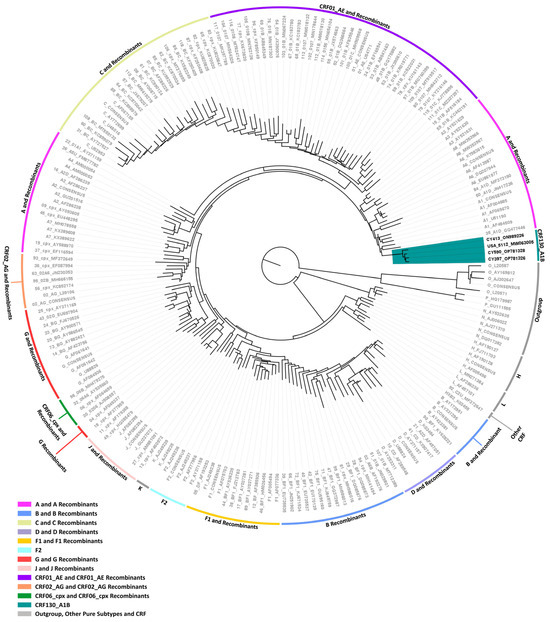 Maximum likelihood phylogenetic tree analyses of two near-full-length HIV-1 genome (790–8795 in the HXB2 genome) and one partial HIV-1 genome (790–5250 in the HXB2 genome) nucleotide sequences of the three HIV-1 recombinants, subtyped either as “Rec. of B, A1” or “Rec. B, A1, F1” based on the HIV-1 pol region (2253–5250 in the HXB2 genome), as well as the isolate 5112 (GenBank accession number: MW063005), which was sampled in the United States of America (USA) and was identified through Basic Local Alignment Search Tool (BLAST) analyses (https://www.hiv.lanl.gov/content/sequence/BASIC_BLAST/basic_blast.html (accessed on 13 November 2023)). The three HIV-1 recombinant sequences were isolated from whole blood samples of three respective individuals infected with HIV-1 collected in Cyprus. One of three samples was collected as part of a prospective molecular epidemiology study (C. Topcu et al., manuscript in preparation for publication) [21] conducted from 9 March 2017 to 14 October 2021, and the remaining two were collected as part of the routine HIV-1 genotypic drug resistance analyses performed by our laboratory within the same time period. Of the three individuals, all were chronically infected with HIV-1. One of them that derived from the prospective molecular epidemiology study was antiretroviral-naïve, while the other two individuals were not. The phylogenetic analyses were executed against a reference dataset of all known HIV-1 group M subtypes (A, B, C, D, F, G, H, J, K, and L) and circulating recombinant forms (CRFs) (RIP Alignment 2020) downloaded from the Los Alamos HIV Sequence Database (http://www.hiv.lanl.gov (accessed on 13 November 2023)) using MEGA X software. The HIV-1 clades are color coded at the periphery of the phylogenetic tree in accordance with the HIV-1 genotypic subtypes of the reference sequences, which are also denoted next to each HIV-1 clade. The color coding is also described on the bottom left of the figure. Reference sequences, labeled in grey, are titled to present the HIV-1 genotypic subtype, followed by the GenBank accession number. The three HIV-1 recombinant query sequences from Cyprus, labeled in black, are titled to present their unique laboratory identification number, in which the prefix CY is followed by a number denoting the laboratory code, along with their GenBank accession number. The branches highlighted with the color teal display the HIV-1 recombinant putative transmission cluster, consisting of the samples CY397, CY413, and CY590, as well as the isolate 5112. All four of these samples making up the HIV-1 recombinant putative transmission cluster were used to characterize the novel CRF130_A1B strain.