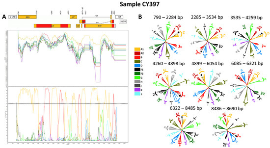 Consequently, each of the near-full-length HIV-1 recombinant query sequences consisted of four fragments of subtype A1 and four fragments of subtype B. Meanwhile, the partial HIV-1 recombinant query sequence was determined to agree with these findings in the regions that were available. Figure 5A displays the mosaic genomic map accompanied by the bootscan and similarity plot for sample CY397, which represents this particular recombinant putative transmission cluster. Additional schematics depicting the findings for the other two Cypriot and one USA sample can be found in Figure S1 of the Supplementary Materials. The eight fragments were divided by seven putative identical intersubtype recombination breakpoints. The seven potential intersubtype recombination breakpoints (beginning from the 5′ end) were identified at nucleotide positions 2285, 3535, 4260, 4899, 6070 ± 15, 6322, and 8486, as indicated in the HXB2 genome (Figure 5A).