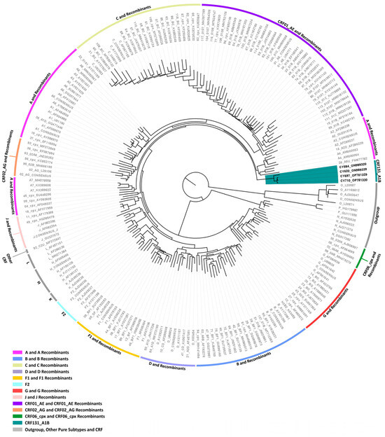 Maximum likelihood phylogenetic tree analyses of the near-full-length HIV-1 genome (790–8795 in the HXB2 genome) nucleotide sequences of the four HIV-1 recombinants subtyped either as “Rec. of B, A1” or “Rec. B, A1, D” based on the HIV-1 pol region (2253–5250 in the HXB2 genome). The four HIV-1 recombinant sequences were isolated from whole blood samples of four respective individuals infected with HIV-1, collected in Cyprus as part of a prospective molecular epidemiology study (C. Topcu et al., manuscript in preparation for publication) [21] conducted from 9 March 2017 to 14 October 2021. Of the four individuals infected with HIV-1, all were newly diagnosed and antiretroviral-naïve. The phylogenetic analyses were executed against a reference dataset of all known HIV-1 group M subtypes (A, B, C, D, F, G, H, J, K, and L) and circulating recombinant forms (CRFs) (RIP Alignment 2020) downloaded from the Los Alamos HIV Sequence Database (http://www.hiv.lanl.gov (accessed on 13 November 2023)) using MEGA X software. The HIV-1 clades are color coded at the periphery of the phylogenetic tree in accordance with the HIV-1 genotypic subtypes of the reference sequences, which are also denoted next to each HIV-1 clade. The color coding is also described on the bottom left of the figure. Reference sequences, labeled in grey, are titled to present the HIV-1 genotypic subtype, followed by the GenBank accession number. The four HIV-1 recombinant query sequences from Cyprus, labeled in black, are titled to present their unique laboratory identification number, in which the prefix CY is followed by a number denoting the laboratory code, along with their GenBank accession number. The branches highlighted with the color teal display the HIV-1 recombinant putative transmission cluster, consisting of the samples CY584, CY620, CY697, and CY710. All four of these samples making up the HIV-1 recombinant putative transmission cluster were used to characterize the novel CRF131_A1B strain.