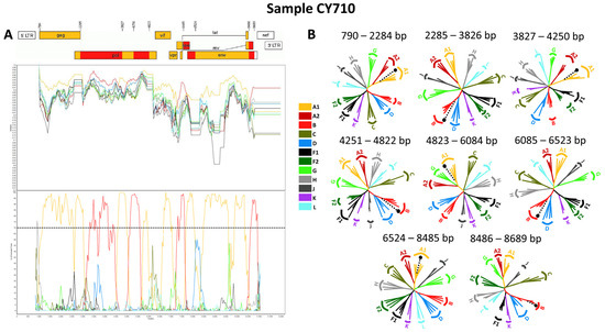 Four near-full-length HIV-1 genome (790–8795 in the HXB2 genome) nucleotide sequences derived from samples CY584, CY620, CY697, and CY710 underwent bootscan and similarity plot analyses. The analyses verified the existence of a previously undocumented series of recombination events among the established CRFs. The uniqueness of the HIV-1 recombinants was also evident in their exclusive clustering within the generated maximum likelihood tree shown in Figure 6. As such, akin to the CRF130_A1B strain, each of the four HIV-1 recombinant query sequences was composed of four subtype A1 fragments and four subtype B fragments. Figure 7A illustrates the mosaic genomic map along with the bootscan and similarity plot for sample CY710, which was employed to represent this recombinant putative transmission cluster. The schematics displaying the findings for the remaining three samples are available in Figure S1 of the Supplementary Materials. The eight fragments were divided by seven putative identical intersubtype recombination breakpoints. The seven potential intersubtype recombination breakpoints (beginning from the 5′ end) were identified at nucleotide positions 2285, 3827, 4251, 4823, 6085, 6524, and 8486, as indicated in the HXB2 genome (Figure 7A).