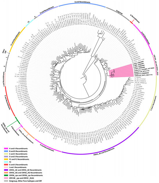 Maximum likelihood phylogenetic tree analyses of three near-full-length HIV-1 genome (790–8795 in the HXB2 genome) and one partial HIV-1 genome (2253–8795 in the HXB2 genome) nucleotide sequences of the four HIV-1 recombinants subtyped as “Rec. of A1, F1” based on the HIV-1 pol region (2253–5250 in the HXB2 genome), as well as the isolate B (GenBank accession number: MN989925), isolate EH (GenBank accession number: MT417770), isolate CHU3903 (GenBank accession number: KP718932), and isolate BS72 (GenBank accession number: KR017779) that were identified through Basic Local Alignment Search Tool (BLAST) analyses (https://www.hiv.lanl.gov/content/sequence/BASIC_BLAST/basic_blast.html (accessed on 13 November 2023)). Specifically, the isolates B and EH were sampled in Belgium, while isolates CHU3903 and BS72 were sampled in Cameroon. The four HIV-1 recombinant sequences were isolated from whole blood samples of four respective individuals infected with HIV-1, collected in Cyprus as part of a prospective molecular epidemiology study (C. Topcu et al., manuscript in preparation for publication) [21] conducted from 9 March 2017 to 14 October 2021. Of the four individuals infected with HIV-1, all were newly diagnosed and antiretroviral-naïve. The phylogenetic analyses were executed against a reference dataset of all known HIV-1 group M subtypes (A, B, C, D, F, G, H, J, K, and L) and circulating recombinant forms (CRFs) (RIP Alignment 2020) downloaded from the Los Alamos HIV Sequence Database (http://www.hiv.lanl.gov) using MEGA X software. The HIV-1 clades are color coded at the periphery of the phylogenetic tree in accordance with the HIV-1 genotypic subtypes of the reference sequences, which are also denoted next to each HIV-1 clade. The color coding is also described on the bottom left of the figure. Reference sequences, labeled in grey, are titled to present the HIV-1 genotypic subtype, followed by the GenBank accession number. The four HIV-1 recombinant query sequences from Cyprus, labeled in black, are titled to present their unique laboratory identification number, in which the prefix CY is followed by a number denoting the laboratory code, along with their GenBank accession number. The branches highlighted with the color pink display the HIV-1 recombinant putative transmission cluster, consisting of the samples CY639, CY805, CY824, and CY842, as well as the isolates B, EH, CHU3903, and BS72. Seven of these eight samples making up the HIV-1 recombinant putative transmission cluster were used to characterize the novel CRF138_cpx strain, whereas the remaining sample, isolate BS72, that was identified through the BLAST analyses, was characterized as the unique recombinant from (URF) of CRF138_cpx, “Rec. of 138_cpx, F2, U”. Isolate BS72 also appears within the HIV-1 recombinant putative transmission cluster highlighted in pink, presenting its high genetic similarity to the CRF138_cpx strain.