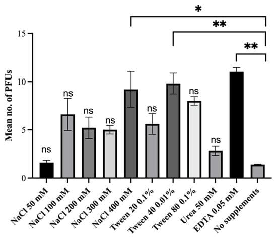 The mean plaque forming units (PFUs) eluted from spiked fecal matter as a result of the addition of chemicals. One-way ANOVA with post hoc Bonferroni test was performed between the mean PFUs eluted in the treatment group and the mean PFUs in the control group of no supplements. ‘*’ indicates a p value of <0.05, ‘**’ indicates a p value of <0.01, ‘ns’ indicates a p value of >0.05. Expected PFUs was 17.