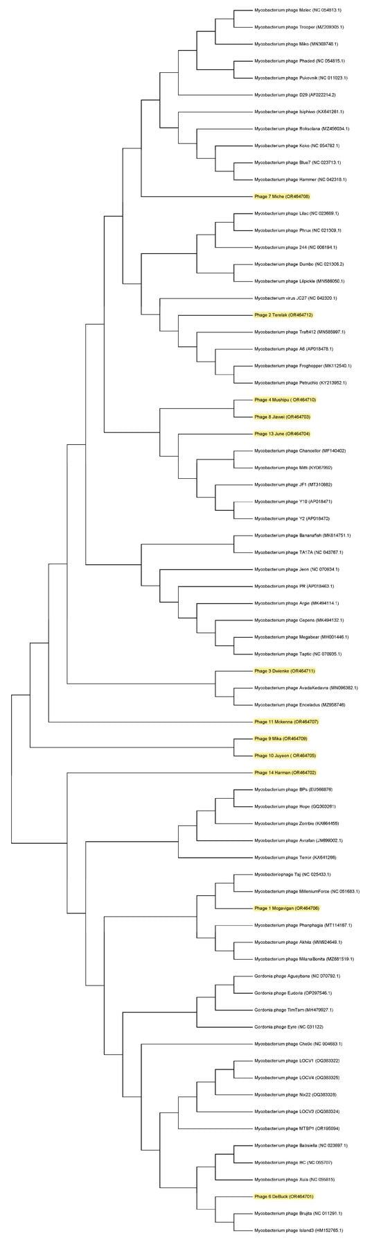 A phylogenetic tree comparing the twelve isolated phages to known phages. The phylogenetic tree was compiled with MEGA 11.0.13 software using the Maximum Likelihood method with the bootstrap test method with the number of 1000 replicates using major capsid protein sequences. The newly isolated phages are highlighted in yellow. Comparative genomic analysis revealed that twelve isolated phages are unique and novel although closely related to other Mycobacterium phages.