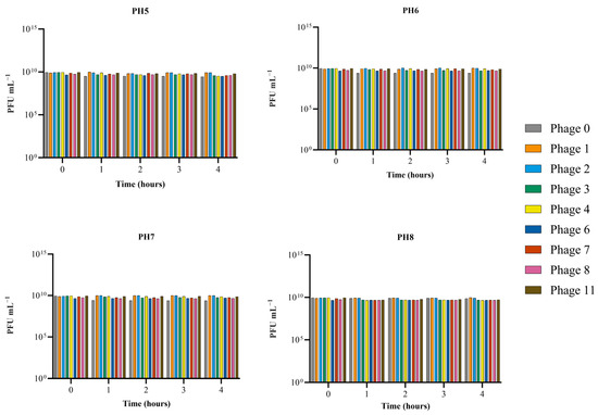 The effect of pH was investigated for all eight phages capable of lysing MAP plus D29. After an exposure time of 1 h, all nine phages were still capable of lysing bacteria between pH 5.0 and 8.0 and showed no significant reduction in the titer (p-value > 0.05) after 4 h. Phage 0 showed the highest susceptibility to a change in pH (Figure 4).