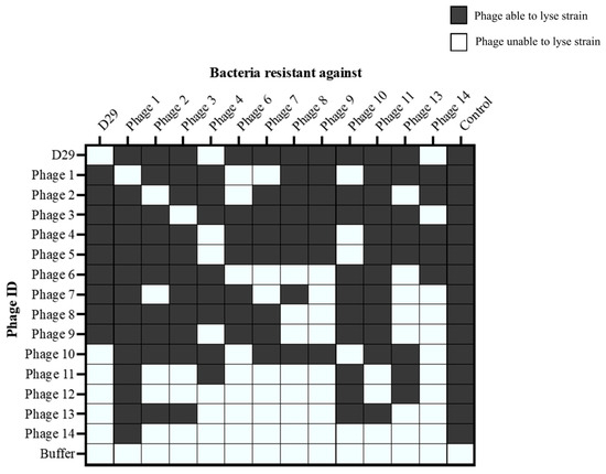 Lysis capability of mbps (0–14) spot tested on phage-resistant strains of M. smegmatis. The data represents the lysis capability of each phage, based on spot tests. The Y axis shows the phage tested, and the X axis shows the resistance strains of M. smegmatis that the phage was plated onto. The phage ID on the X axis pertains to the phage that the M. smegmatis strain was originally made resistant to. The lysis capability refers to the ability of the phages to form a plaque on a bacterial lawn. The control strain was M. smegmatis mc2155. Grey indicates mbp was able to lyse strain.