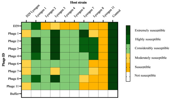 The susceptibility of lysogens to newly isolated mbps. Lysogens were assigned a susceptibility score based on the MOI. The MOI for each phage–lysogen assay was calculated by dividing the initial number of phages in the lowest dilution causing complete lysis. Those lysogens with MOI of less than 0.001, were considered extremely susceptible, 0.001 < MOI > 0.01 were highly susceptible, 0.01 < MOI > 0.1 considerably susceptible, 0.1 < MOI > 1 moderately susceptible, 1 < MOI > 10. Those lysogens with an MOI greater than 10 were considered not susceptible.
