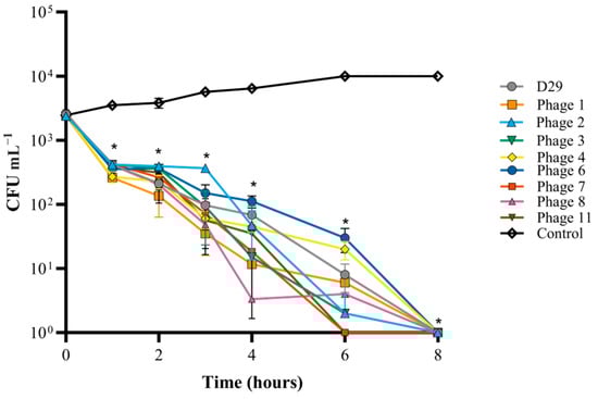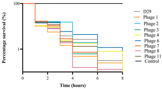 Eight mbps plus D29 were individually tested to assess their efficacy in milk replacer and colostrum. Low titers of bacteria were used to simulate the concentrations expected from environmental contamination (~1 × 103 CFU mL−1) [37]. Reconstituted colostrum aliquots spiked with M. smegmatis were inoculated with high titers of each phage (1 × 108 PFU mL−1). A Wilcoxon test was used to test the significance of the reduction in bacterial counts. For each mbp, the complete killing of M. smegmatis occurred within 8 h (Figure 7). When comparing the CFU mL−1 of M. smegmatis at 0 h and 8 h for each phage, there was a significant reduction in the colonies of bacteria recovered (p value < 0.01). Each individual phage was also tested in reconstituted milk replacer and the % survival was calculated (Figure 8). When compared to the negative control, the survival percentage was reduced to 0% within 8 h, as no CFUs could be recovered.