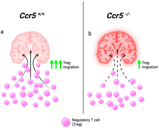 Ccr5-expressing regulatory T cells mitigate CNS inflammation. After entry into the CNS, neurotropic flaviviruses such as JEV and LGTV trigger inflammation mediated by both innate immune cells and cytokines in the CNS that is mitigated by the presence of regulatory T cells (Tregs) guided into the CNS through Ccr5 expression in wild-type (Ccr5+/+) mice. Solid arrows represent the direction of Tregs into the infected site (a). In the absence of Ccr5, Treg migration into the CNS is impaired, leading to uncontrolled inflammation of the brain tissue (represented by the red shadow). Dotted arrows represent reduced migration of Tregs into the infected brain (b). CNS: central nervous system; JEV: Japanese encephalitis virus.
