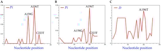 - Rozas, J.; Ferrer-Mata, A.; Sánchez-DelBarrio, J.C.; Guirao-Rico, S.; Librado, P.; Ramos-Onsins, S.E.; Sánchez-Gracia, A. DnaSP 6: DNA Sequence Polymorphism Analysis of Large Data Sets. Mol. Biol. Evol. 2017, 34, 3299–3302. [Google Scholar] [CrossRef]