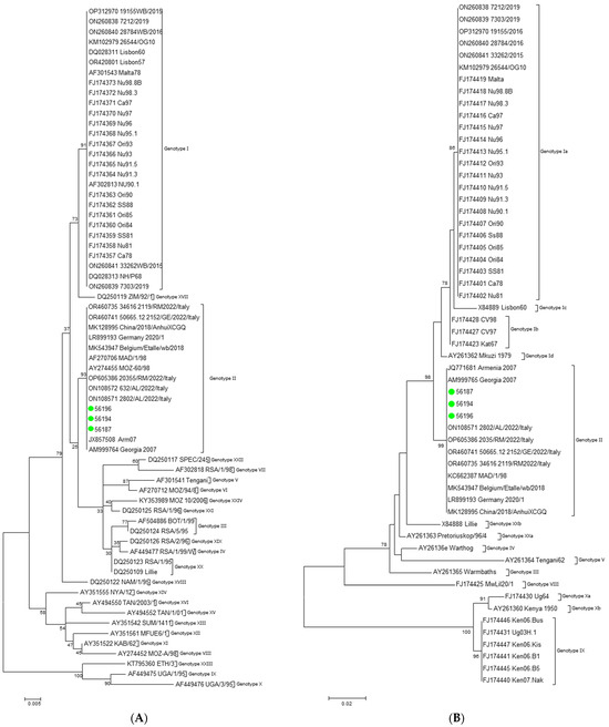The phylogenetic trees depicted in Figure 1A (p72) and Figure 1B (p54) confirm that our sequences clustered with genotype II isolates from different countries, including strains from mainland Italy.