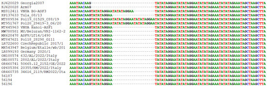 To better differentiate the Sardinian strains, sequencing of the region located between the I73R and I329L genes, characterized by the presence of TRS, was performed. Figure 2 shows the alignment of the I73R/I329L sequences obtained in this study with those of national and international strains belonging to genotype II. Our strains had 100% identity compared with those from mainland Italy [27,48] and other European and Asian countries and differed from Georgia2007 and Armenia07 isolates for one tandem repeat [7,49].