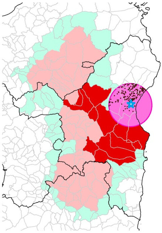 Location of the outbreak farm (blue star) and the pig farms (black dots) located in the protection and surveillance area (pink) around the outbreak with respect to restriction zones I (light blue), II (light pink), and III (red) for ASFV genotype I in Sardinia.
