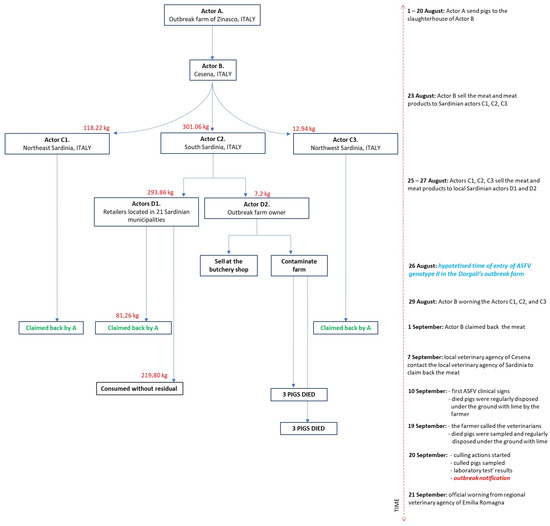 Subsequently, the main hypothesis is the long-distance jump of the virus from B to C1, C2, and C3: on 23 August, the meat products were sold from the wholesalers of Cesena to three Sardinian retailers, located in the northwest, northeast, and south of the island. The meat products arrived on the island on 24 August and were claimed back on 29 September by Actor B. Actors C1 and C3 claimed back all the products (118.22 kg and 12.94 kg, respectively), while C2 claimed back only 80.26 kg. The remaining 219.80 kg of infected meat was sold all over the Sardinian region, as illustrated in Supplementary Materials Figure S2. This 219.80 kg of meat was notified as consumed without residuals by local retailers. One of these sales probably caused the outbreak of ASFV genotype II in Dorgali (Nuoro province of Sardinia). After the purchase of the meat products by C2, Actor D2 fed his pigs with food waste (probably including the infected meat) on 26 August. After exactly 15 days (10 September), the first three pigs died and subsequently another three died on 19 September. On the same day, the farmer called local veterinarians, who undertook culling, and the outbreak was notified. Between 19 and 20 September, samples from culled animals were collected and tested, and the results were disclosed to the local authorities. The culled pigs tested virologically and serologically negative. Thus, a recent intra-farm infection that was immediately stopped can be hypothesized.