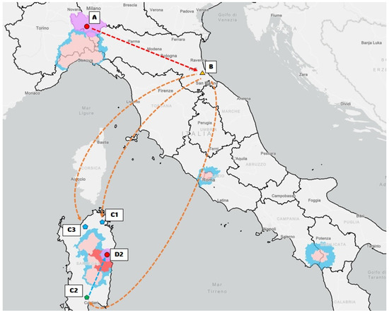 This figure geographically illustrates the tracing (arrows) of the meat and meat products that hypothetically caused the ASFV genotype II outbreak. Actors A (red dot), B (yellow triangle), C1 (blue pentagon), C2 (green pentagon), C3 (blue pentagon), and D2 (red dot) refer to farms in Zinasco (Pavia province, Lombardia region), wholesalers in Cesena (Forlì-Cesena province, Emilia-Romagna region), retailers in Northwest Sardinia, retailers in Northeast Sardinia, retailers in South Sardinia, and a farmer in Dorgali, respectively. The blue areas indicate level I restriction zones, the pink areas indicate level II restriction zones, the red area indicates the level III restriction zone, and the violet areas indicate the protection and surveillance areas around outbreaks.