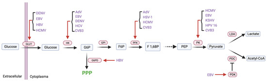 | HK2, PDK1, GLUT1, PKM2 | EBV | Up-regulating expression | DNA virus | |