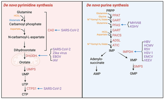 - Sepúlveda, C.S.; García, C.C.; Damonte, E.B. Inhibitors of Nucleotide Biosynthesis as Candidates for a Wide Spectrum of Antiviral Chemotherapy. Microorganisms 2022, 10, 1631. [Google Scholar] [CrossRef]