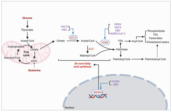 | Lipid synthesis | SREBP1 | HCMV | Up-regulating transcriptional factor activity | DNA virus |