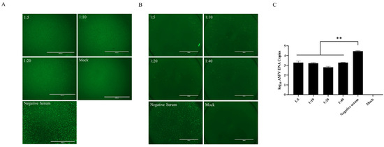 Blood samples were collected from the immunized mice and rabbits in untreated vacutainer tubes 14 days after the last booster immunization, to obtain sera. PAMs were cultured in 96-well plates overnight in a 37 °C incubator with 5% CO2. ASFV-ΔCD2v and ASFV-WT were each diluted to 100 TCID50 per well. Sera from rabbits immunized with rHCLV-p34 and mice immunized with p34 protein were diluted at 1:5, 1:10, and 1:20 in RPMI 1640 medium, mixed with ASFV-ΔCD2v and ASFV-WT, and incubated for 1 h at 37 °C. The mixture was then inoculated into the PAMs and incubated at 37 °C in 5% CO2. At 48 h post-infection (hpi), the infected cells were observed under a fluorescence microscope (Nikon TE200; Tokyo, Japan). The infected cells were lysed, the supernatants were collected to extract DNA as described previously [28], and viral genome copies in the rabbit sera were quantified using qPCR.