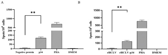 IFN-γ response in the PBMCs from the convalescent pigs or the rHCLV-p34-vaccinated rabbits. (A) ELIspot assay using the PBMCs from convalescent pigs. The PBMCs collected from the pigs were plated in duplicate and stimulated with DMEM, PHA, the p34 protein, and a negative protein. (B) The PBMCs from all the experimentally infected rabbits were stimulated with the p34 protein and evaluated by the ELIspot assay. Mock and PHA stimulation were also carried out as negative and positive controls, respectively. The results were presented as spot-forming cells (SFCs)/106 PBMCs or splenocytes, and the data shown were minus media background counts. Mean responses for each group are indicated by bars, and statistically significant differences between groups are denoted by asterisks. ** p < 0.01.