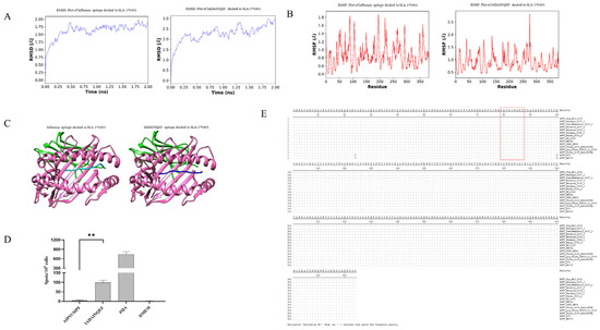 A T-cell epitope is present on the p34 protein. The root mean square deviation (RMSD) and root mean square fluctuation (RMSF) were used to detect the binding of the epitope with SLA-1*0401. (A) Root-mean-square deviation plots of the positive reference and the CD8+ T-cell epitope IADAINQEF for the residues of swine leukocyte antigen–epitope complexes under 5-ns simulation. (B) Root-mean-square fluctuation plots of the positive reference and the CD8+ T-cell epitope IADAINQEF for the residues of swine leukocyte antigen–epitope complexes under 5-ns simulation. (C) The 3D complex structures of positive reference and the CD8+ T-cell epitope IADAINQEF were docked to the binding groove of swine leukocyte antigen-1*0401. (D) The major histocompatibility complex (MHC) restriction for stimulation of T cells by synthetic epitopes was identified as MHC class I. Further experiments showed that IFN-γ secretion was detected upon in vitro restimulation with a peptide by ELIspot. (E) Multiple sequence alignment of the epitope of ASFV of different genotypes. ** p < 0.01.