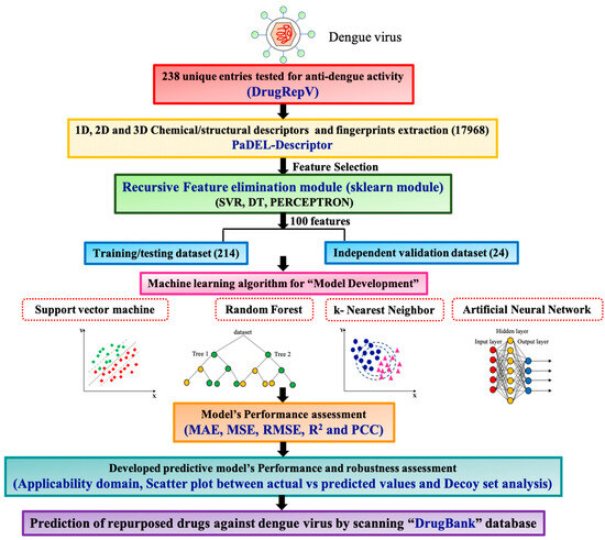 In this endeavor, computational approaches can be used to predict potent antivirals to reduce the time and cost. It could also be advantageous to accelerate the drug discovery process. In light of this, our group developed various machine learning-based antiviral predictors using the quantitative structure–activity relationship (QSAR) information of molecules/peptides such as AVCpred [15], AVPpred [16], AVP-IC50 Pred [17], HIVprotI [18], Anti-flavi [19], etc. Recently, we have developed a predictive algorithm for SARS-CoV-2, i.e., anti-corona [20], and for Ebola virus, i.e., anti-Ebola [21]. However, the platform is required to predict the repurposed drugs targeting the DENV utilizing machine learning techniques (MLTs).