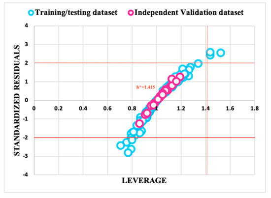 Moreover, along with the model performance, model accuracy for the new prediction also plays a crucial role. Applicability domain analysis defines the boundary of the developed model for its reliability. For accurate predictions of a new compound using a developed model, it is essential for the chemical properties of the compound to fall within the applicability domain of the compounds employed in training the model [34]. The reliability of these developed models was assessed using the William’s plot based on the distance-based leverage approach. These plots depict the relationship between the leverage and standardized residuals. The formula of the leverage threshold (h*) is