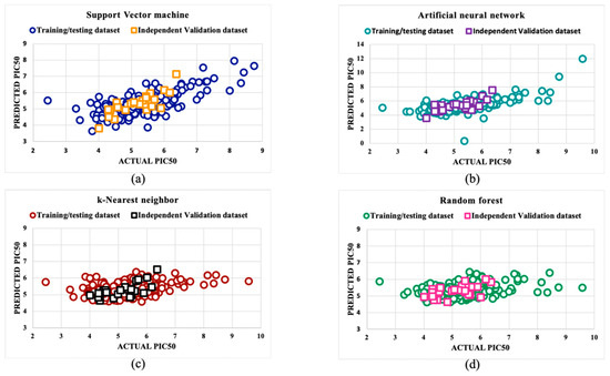 The robustness of the (a) support vector machine, (b) artificial neural network, (c) k-nearest neighbor, and (d) random forest-based predicted models was assessed by scatter plots between the actual and predicted pIC50 values of the molecules.