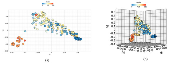 Furthermore, a chemical clustering analysis for the 238 molecules was also assessed using the multidimensional scaling (MDS) algorithm and binning clustering methods. Chemical clustering is generally used to identify outliers and understand chemical compounds’ arrangement in a chemical space. The binning clustering method made the chemical clusters based on the user-defined similarity cut-off values. We used a Tanimoto coefficient (Tc) of 0.6 as the similarity coefficient, which is the proportion of the features shared among two compounds divided by their union, i.e., c/(a + b + c), where c is the number of features common in both compounds, while a and b are the number of features that are unique in one or the other compound, respectively [45]. The Tanimoto coefficient value generally lies between 0 and 1, with higher values depicting greater similarity and vice versa. Using a Tc of 0.6 showed that compounds are joining with 0.6 similarity or more to aggregate numerous clusters using the “single linkage” rule. As many clusters are forming in the anti-dengue chemicals, they are well spread in the chemical space. The binning cluster results are represented in tabular form with the compound ID, bin/cluster size, and bin/cluster ID. Multidimensional scaling (MDS) creates a matrix of “item-to-item” distances, and each item is assigned with coordinates and represents these distances in the form of 2D and 3D scatter plots. MDS-generated plots show that anti-dengue chemicals are well distributed in the 2D and 3D chemical space. Binning clustering utilizes internally developed C++ implementation, and MDS uses the “cmdscale” function implemented in R. These methods showed that these chemicals are very dissimilar [20,46].