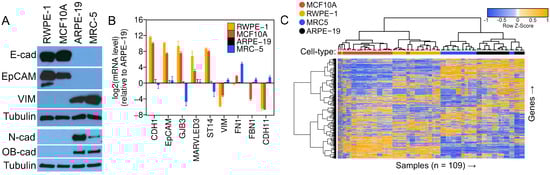The hierarchical clustering definitively separated the four cell types into distinct clades (Figure 1C), indicating that the variation in gene expression due to batch effects, or other confounding variables, was minimal compared to the variation due to cell type identity. Two major phenotypic clades emerged, with ARPE-19 cells clustering closely with MRC-5 cells, and MCF10A cells clustering alongside RWPE-1 cells (Figure 1C). Analysis of individual epithelial and mesenchymal marker transcripts revealed that ARPE-19 displayed a gene expression pattern akin to that of MRC-5, with expression levels closely resembling those of MRC-5 cells and exhibiting an inverse correlation with those of MCF10A or RWPE-1 cells (Figure 2). For instance, CDH1 and EPCAM exhibited extremely low mean expression levels (<1 rpkm) in both ARPE-19 and MRC-5 cells, while robust expression (between 32 and 64 rpkm) was observed in MCF10A and RWPE-1 cells. Conversely, mesenchymal markers, such as CDH11, FBN1, VIM, ZEB1, and ZEB2, displayed an opposite trend (Figure 2).