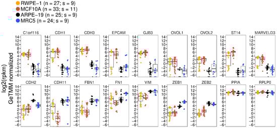 mRNA Expression Levels of Epithelial and Mesenchymal Genes from Public Transcriptomics Data. Relative expression levels of epithelial marker genes (upper panel), mesenchymal marker genes (lower panel, first seven plots), and normalization controls (PPIA and RPLP0). RNA-sequencing data were re-processed from the raw data from 38 studies, representing 109 sequencing runs (RWPE-19, n = 27; MCF10A, n = 33; ARPE-19, n = 25; MRC5, n = 24). Data represent the absolute expression level in reads-per-kilobase-per-million (rpkm) in each cell type, after cross-sample normalization of the 109 runs using the GeTMM procedure (see Section 2). Data are shown as strip plots with overlaid box-plots showing the median and interquartile range in each cell type. n = number of sequencing runs; s = number of studies.