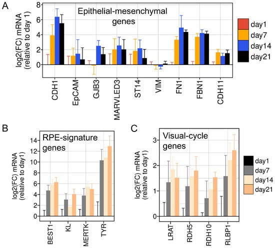 Gene Expression Changes Induced by Long-Term Culture of ARPE-19 Cells. Gene expression changes induced in ARPE-19 cells over three weeks of high-confluency culture. Total RNA was isolated at the indicated time points and reverse-transcribed, and relative mRNA levels were measured using quantitative RT-PCR (qRT-PCR). (A) Relative mRNA levels of epithelial (CDH1, EpCAM, GJB3, MARVELD3, ST14) and mesenchymal (VIM, FN1, FBN1) genes. (B) Relative mRNA levels of RPE-signature genes. (C) Relative mRNA levels of visual cycle genes responsible for retinol metabolism. Data represent the mean +/− SD from three biological replicates assayed in technical triplicate.
