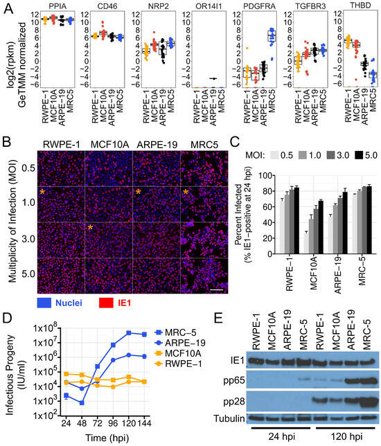 ARPE-19 Cells Phenocopy Fibroblasts in Experimental Infection Assays with Human Cytomegalovirus. (A) Absolute RNA-expression levels of HCMV entry factors across ARPE-19, MCR5, RWPE-1, and MCF10A cells. Data are normalized public gene expression data from Figure 1 and Figure 2. PPIA RNA levels are shown as a normalization control. See Figure 2 and Section 2 for details. (B,C) HCMV susceptibility analysis. Fluorescence microscopy images of different cell types infected with HCMV TB40-BAC4 at various MOIs. IE1 (red) was visualized at 24 hpi by indirect immunofluorescence and nuclei were counterstained with DAPI (blue). Orange asterisks mark the MOIs used for growth curve analysis in panel D. Scale bar; 100 m. The percentage of infected cells (C) was quantified for each cell type and multiplicity using Cellprofiler software (see Section 2). Data are mean +/− SD of three independent infections. (D) Single-step growth analysis of HCMV across four cell types. Infectious progeny released into the cell supernatants was assayed by IU-assay over a six-day time course. MRC-5, ARPE-19, and RWPE-1 cells were infected at 1 IU/cell. MCF10A cells were infected at 3 IU/cell. Data are mean +/− SD of three independent infections per cell type, per time point. In most cases, error bars are smaller than the data point symbols. (E) Immunoblot of HCMV proteins at 24 and 120 hpi, in infected epithelial and mesenchymal cell lines. Tubulin is shown as a loading control.