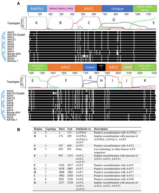 Probability of various tree topologies for AAV.Po.Guelph as predicted by the Geneious Dual Brothers recombination plugin. (A) The rectangular overlay above the tree topology probability graph indicates the likely origin of the different sequence regions of the capsid. For specific color-coded tree topologies (1 through 8), see Figures S2 and S3. (B) Description and location of topology regions A through K indicating the likely lineage of specific capsid regions.