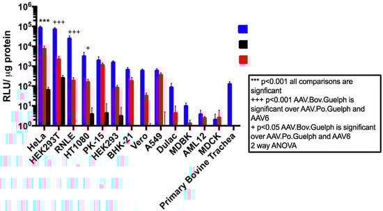 The in vitro transducing properties of AAV.Bov.Guelph and AAV.Po.Guelph were evaluated in a panel of mammalian cell lines including HeLa, HEK 293T, RLE, HT1080, PK-15, HEK293, BHK-21, Vero, A549, Dulac, MDBK, AML-12, MDBK, and polarized bovine epithelial cells. The human AAV serotype 6 was included as a benchmark for in vitro transduction performance, since AAV6 and AAV1 are considered among the best serotypes for the transduction of a wide variety of cell types []. The panel of cell lines was highly varied and consisted of several different species and cell types, including human-derived cell lines HeLa (cervical cancer), HEK 293T (kidney), HT1080 (fibrosarcoma), HEK293 (kidney), and A549 (lung adenocarcinoma); porcine cell lines PK-15 and Dulac (both kidney); a bovine kidney cell line (MDBK); and bovine polarized tracheal epithelial cells. In addition, Vero cells (African green monkey kidney), MDCK (canine kidney), and rodent BHK-21 (Syrian golden hamster kidney) and AML-12 (mouse liver) cells were also included in the panel. Interestingly, when infected at the same multiplicity of infection (MOI), AAV.Bov.Guelph demonstrated superior transduction in the majority of cell lines tested compared to both AAV6 and AAV.Po.Guelph. AAV.Bov.Guelph showed relative luciferase expression of at least an order of magnitude higher than AAV6 in many of the cell lines tested, including HeLa, 293T, RLE, HT1080, HEK293, Vero, Dulac, and polarized bovine trachea cells (Figure 4). In other cases, AAV.Bov.Guelph exhibited greater expression than AAV6 but with less than a 10-fold increase. This was evident for PK-15, BHK-21, A549, and AML-12 cell lines, with AAV.Bov.Guelph showing a modest improvement over AAV6 in these lines. Interestingly, luciferase expression in MDBK bovine cells was lower than that in human cell lines 293T, HeLa, and HT1080 for AAV.Bov.Guelph. However, this was still at least an order of magnitude higher than AAV6 luciferase expression in this cell line. In addition, AAV.Bov.Guelph transduced polarized bovine trachea cells, while neither AAV6 nor AAV.Po.Guelph was able to transduce these cells to any degree.