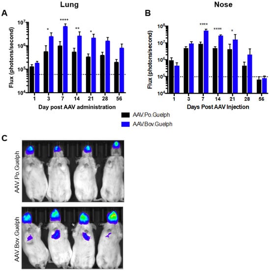 AAV.Po.Guelph and AAV.Bov.Guelph transduction of the mouse airway. A total of 1 × 1011 vg of AAV.Po.Guelph-Luciferase or AAV.Bov.Guelph-Luciferase was administered intranasally to six-week-old female Balb/c mice (n = 4/group). Luciferase expression in the (A) lungs and (B) nose was quantified on days 1, 3, 7, 14, 21, 28, and 56 after AAV administration. The dashed lines indicate the background threshold. **** p < 0.0001, ** p < 0,01, and * p < 0.05. (C) Images from three days after intranasal administration of AAV.