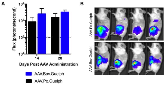 To evaluate the transducing properties of AAV.Po.Guelph and AAV.Bov.Guelph expressing firefly luciferase when administered systemically, groups of mice (n = 4) were intraperitoneally injected with 1 × 1011 vg of vector, and luciferase expression in the peritoneal cavity was quantified on days 14 and 28 post-administration (Figure 6A), with the in vivo image obtained on day 28 shown (Figure 6B). No significant differences were observed between vectors at either timepoint. Confirmation of the liver as the target organ for these capsids was confirmed histologically (Figure S4).