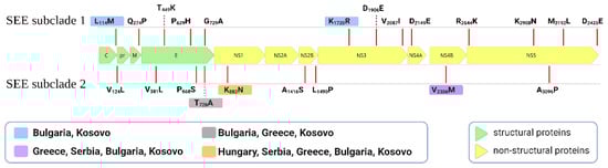 The sequenced WNV genomes from Kosovo showed a low degree of genetic variation (0.1–0.8% for nucleotide sequence and 0–0.6% for the amino acid, respectively). Although we generated a small number of genomes, the same pattern of variation was observed for the southeast European clade (SEEC) dataset (n = 47, 0.1–1% for nucleotides and 0.1−0.6% for amino acid sequences). The comparative analysis of SEEC polyproteins revealed a mutational profile that largely reflects the MCC tree topology. Most non-synonymous substitutions found in Kosovar WNV strains were unique (17 of 22 sites), whilst amino acid mutations shared with the rest of SEEC were present on both structural and non-structural proteins (Figure 1). Moreover, multiple non-synonymous mutations, primarily found within the nonstructural genes, showcase distinct geographical patterns specific to the SEEC genomes (Figure 1).