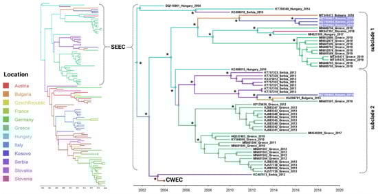 The Bayesian maximum clade credibility (MCC) tree has been constructed to depict the time-scaled phylogeny of West Nile virus (WNV) lineage 2, based on complete genome sequences, which includes the southeast European subclade (SEEC). The colored tree branches indicate the most likely geographic location of their descendant nodes. The time axis below the tree represents years before the last sampling time. Bayesian posterior probabilities (≥90%) and maximum likelihood bootstrap support (≥80%) are denoted by asterisks. CWEC: central west European clade.