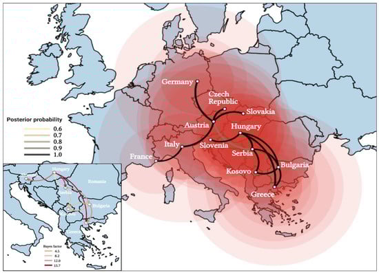 The results suggest that the circulation of WNV in Kosovo was triggered by at least two independent introductions from neighboring countries, one of which (Serbia) is a main hub of WNV dissemination in southeast and central Europe (Figure 2 and Figure 3). The estimation of the tMRCA concerning the Kosovar WNV strains suggests a recent emergence. It is probable that these strains were introduced into Kosovo around 2010–2012. Among the BF estimates, the most robust epidemiological connections were identified between Kosovo and Bulgaria (Bayes factor 4.3), Bulgaria and Kosovo (Bayes factor 4.9), and Serbia and Kosovo (Bayes factor 4.4) (Figure 3). The initial introduction and migration event of WNV lineage 2 into Kosovo was traced back to an ancestor that existed in Serbia around 2012 (95% HPD 2011–2014; posterior probability = 0.98), followed by a second introduction, likely a descendant of an ancestor that probably circulated in Bulgaria, estimated to have emerged around 2010 (95% HPD 2009–2013; posterior probability = 1).