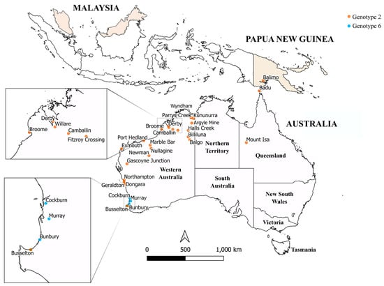Sampling locations of SINV sequenced for this study, within Papua New Guinea (PNG), Malaysia, and Australia. Genotype 2 and 6 viruses (G2, G6) were both sampled within the region with sampling sites represented by orange and blue markers, respectively. Most Sindbis viruses analyzed in the present study were collected in the Australian state of Western Australia. PNG and Malaysia are shaded in orange to represent sampling of G2 viruses from undefined locations within these countries.