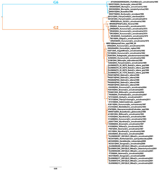 The remaining 61 sequences clustered within G2. Viruses belonging to G2 were sampled from Queensland (QLD) (including the Torres Strait (TS)), Malaysia, Papua New Guinea (PNG), and throughout WA, from 1960 to 2014. Substantial genetic divergence between G2 and G6 was observed, ranging between 25.91 and 26.3% and 14.09 and 14.75% on the nucleotide and amino acid sequence scale, respectively.
