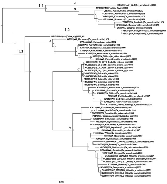 A mid-point rooted maximum likelihood phylogeny of the 61-taxa genotype 2 (G2) Sindbis virus (SINV) dataset. Three distinct lineages (L1–3) were defined in the phylogeny, with minor sub-lineages defined within L1 and L3 (L1A,B, L3A–C). Asterisks indicate nodes with bootstrap values >80%. Taxon nomenclature details the GenBank accession number, isolate name, sampling location and year of sampling. Ae—Aedes, Cx—Culex, grp—group, PNG—Papua New Guinea, QLD—Queensland, spp—species, WA—Western Australia.