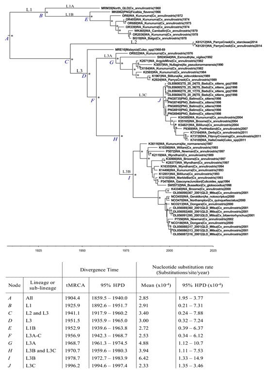 Most of the analyzed sequences clustered within L3, which consisted of viruses sampled from Malaysia, PNG, the TS, QLD, and widely across WA from 1968 to 2011. The lineage demonstrated considerable diversity and comprised three distinct sub-lineages (L3A–C). Malaysian isolate MRE16 had a basal position within L3 and was distinct from the L3A–C viruses. As the MRE16 L3 clade consisted of just a single sequence with no unique features distinguishing it from other L3 sub-lineages, it was not characterized as a distinct L3 sub-lineage. This may change as more archived viruses are sequenced. L3A was diverse, compared with other L3 sub-lineages, and contained isolates sampled over a 12-year period (1976–1990). Interestingly, six viruses sampled in the north of WA were terminal to isolate SW24544, sampled 2–10 years earlier in Exmouth, in the state’s central region of the Gascoyne. SW24544 was up to 1.26% divergent from the six northern isolates at the nucleotide sequence scale, suggesting unsampled diversity in viruses circulating during this period.